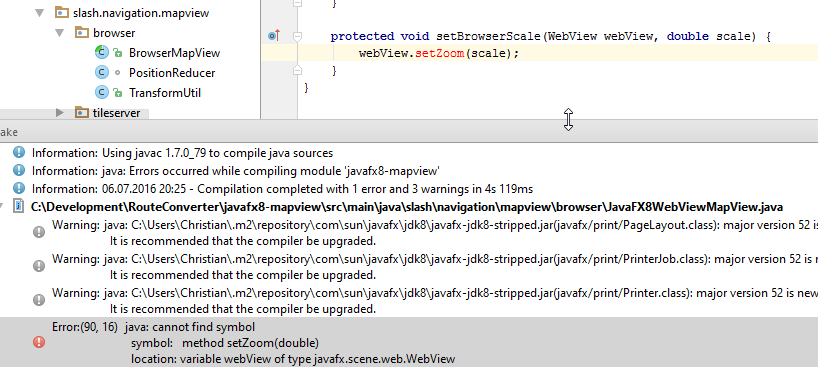 Der Nachteil ist: Java 8 API kann ich nur über Reflektion (Beispiel: JavaFX7WebViewMapView#createMapView - setUserAgent) oder als Third-Party-JAR (Beispiel: JavaFX8WebViewMapView#print - javafx.print Package)  eingeschummelte Java 8 API in Java 7 benutzen.