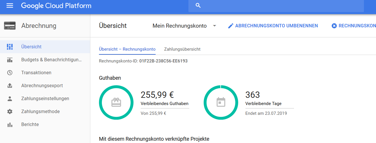 Quote:GCP-Kunden können ihr Guthaben in Höhe von 300 $, das sie für das neue Konto erhalten haben, in die Google Maps Platform investieren. Bei anderen GCP-Guthaben hängt das Vorgehen davon ab, ob es für ein beliebiges oder nur ein spezifisches GCP-Produkt verwendet werden darf. Im Bereich "Abrechnung" der Google Cloud Platform Console kannst du nachlesen, wofür die einzelnen Guthaben eingelöst werden können.