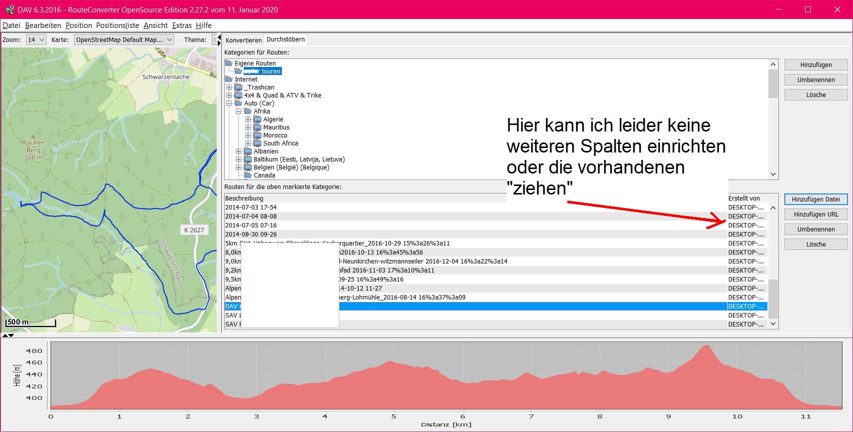 Schade, dass ich keine weiteren Spalten einfügen kann, das wird doch bei "Ansicht" vorgeschlagen, gilt dann nicht für meine eigenen Touren(?). Kann ich kaum glauben. Dann wäre das Programm für mich weitgehendst wertlos. Denn über den Dateinamen (Beschreibung) habe ich seither schon sortiert, gerade das wollte ich nun ändern, weil ich inzwischen dafür zu viele Touren habe. Spalte "Entfernung" ist halt schneller zu durchsuchen als über die Beschreibung.