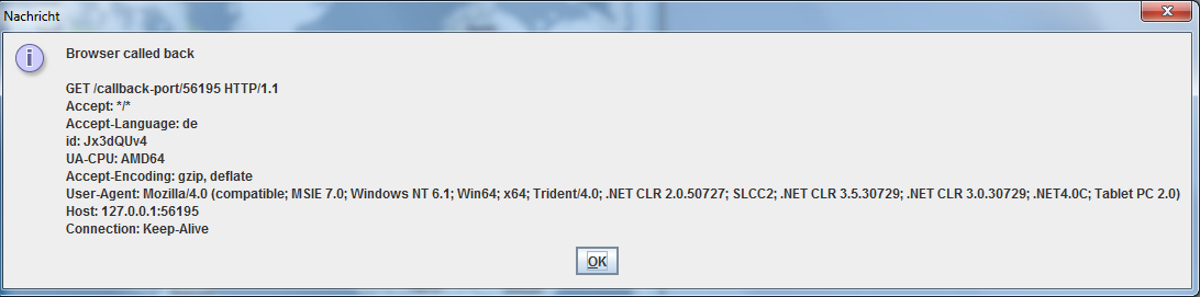 (27.10.2010, 16:21)hvdwolf Wrote: Yes, it does. Good. The next try is to test if the test hits the same origin policy. Please try If successfully started with 'java -jar BrowserTest4Windows64.jar', it should display a window like this: And when you press the large button on the top, it should display this (this will fail on Mac OS and Linux, but should work on Windows): Do you see that?