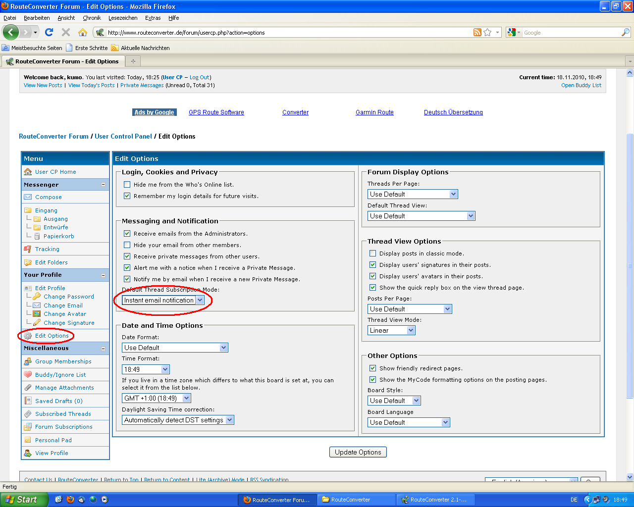 (18.11.2010, 18:33)quotsi Wrote:(17.11.2010, 21:10)routeconverter Wrote: [quote='quotsi' pid='5901' dateline='1289066891'] Ja, das kann ich begreifen, aber warum kein Land oder Landeskennzeichen? (18.11.2010, 18:33)quotsi Wrote: Verstehe ich. Ich bin da kein Experte, das weißt Du. Wenn (und wann) ich testen soll, dann mußt Du nur sagen, welche Umwandlung ich mit minimalstem Verlust vornehmen kann und soll, bevor ich sagen kann, ob alles richtig für GP5 geworden ist. Wenn Du GoPal 5 liest und speicherst, sollte nichts verloren gehen. Beim Konvertieren in andere Formate und zurück sind nur die Koordinaten in jedem Fall stabil, alles andere kann je nach Format verloren gehen. (18.11.2010, 18:33)quotsi Wrote: Ich bin der erste, der erste, der erste ! Endlich mal. :-) (18.11.2010, 18:33)quotsi Wrote: Du bekommst email, wenn sich hier was tut? Das funktioniert bei mir auch nicht... Ja, ich habe 'Instant EMail Notification' unter 'Messaging and Notification' in meinem Profil eingestellt.