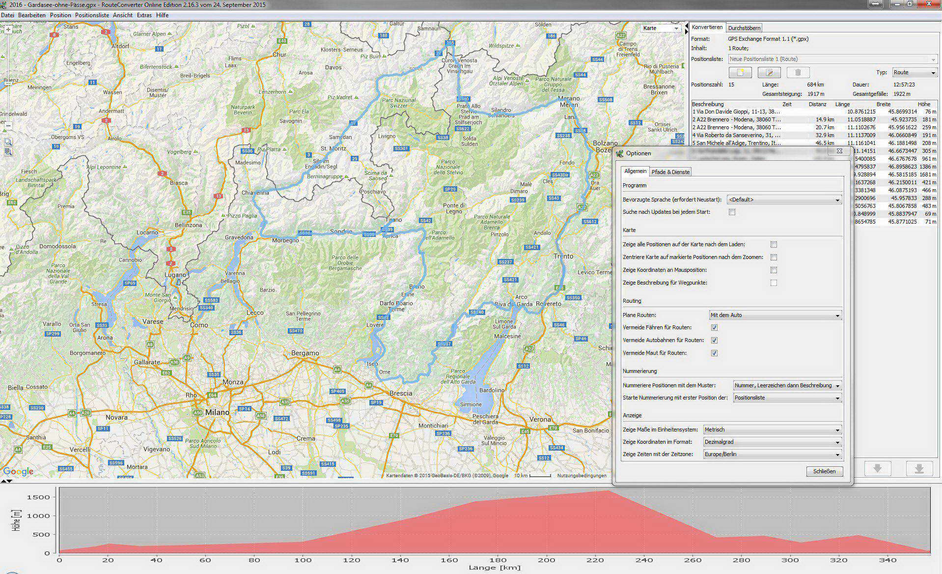 vielleicht täusche ich mich, aber ich meine, dass die Routenerstellung im Modus Fahrrad mal genauso funktioniert hat wie mit der Option Auto. Also man konnte mit dem Typ Route einige Punkte durch Klicken auf die Karte in die Positionsliste übernehmen und auf der Karte wurde dann eine Route über die Straßen hinweg gezeichnet. Das funktioniert momentan in der aktuellen Version und in der davor mit dem Modus Auto und Fuß (Optionen > Plane Routen), aber nicht mit Fahrrad. Früher ging das mal (bin ich mir fast sicher), und sogar nicht nur mit Google Maps als Kartentyp, sondern auch mit Open Cycle Map. Bei Fahrrad als Typ werden zur Zeit nur die Punkte per Luftlinie verbunden. Siehe Screenshots...
