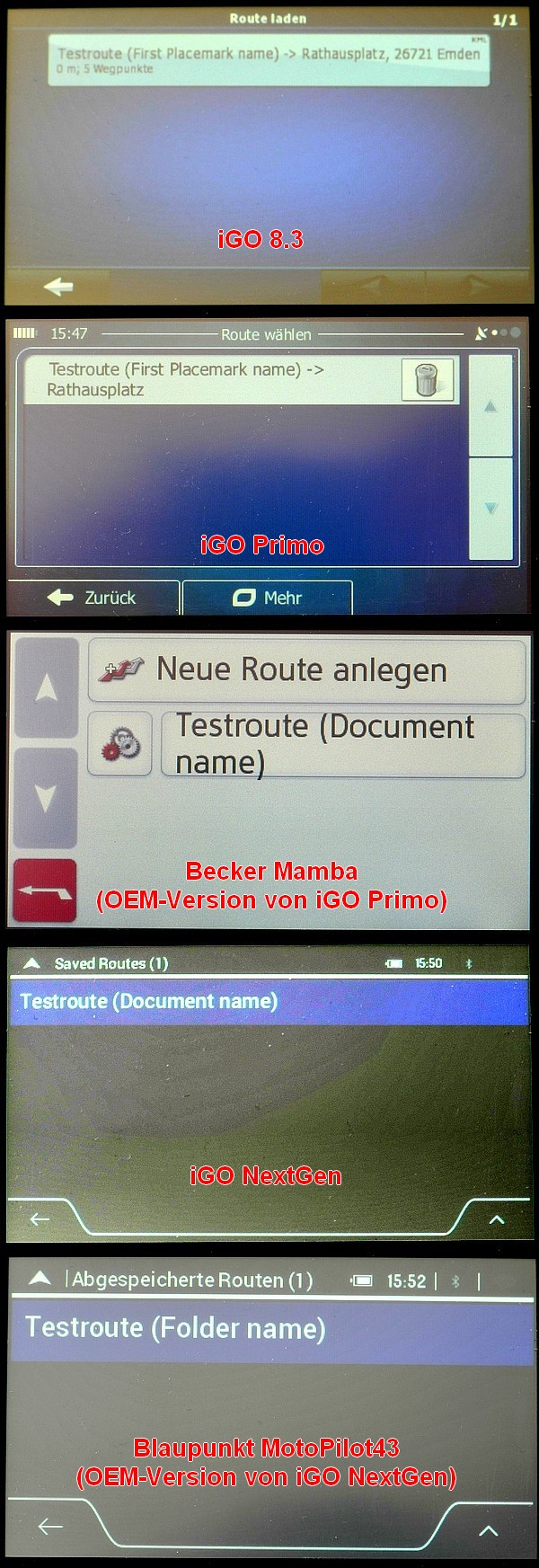 Mit der Vorabversion 2.28.111 habe ich eine Testroute mit 5 Punkten erzeugt und danach per Editor die <name>-Tags so umfrisiert, daß erkennbar wird, welche Version welche Tags anzeigt. Hier ist das Ergebnis, die iGO-Versionen sind von oben nach unten chronologisch sortiert: