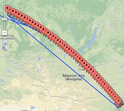 Dieser spezielle Track startet in Peking und geht von dort aus ca. 3000 Kilometer ziemlich genau im Winkel von 312,2° nach Sibirien. Da ist dann wieder genau die gerade Strecke und der Algorithmus nimmt nur Start- und Endpunkt für die Anzeige.
