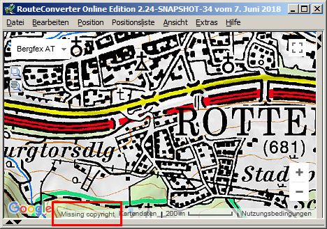 (14.06.2018, 13:41)routeconverter Wrote: Bei mir scheiterte es erst an unbekanntem Copyright: Die Bergfex funktioniert bei mir einwandfrei, trotz des unbekannten Copyrights, es gibt nur eine Fehlermeldung "Missing Copyright" am unteren Kartenrand: Die URLs hab ich mehrfach kontrolliert, es hat ja früher mit exakt den URLs funktioniert, sogar mit "Copyright=Kompass".