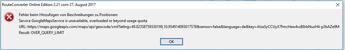 Ich benutze keine Web-Version. Leider scheint das nicht nur bei Routeconverter so zu sein. Ich benutze auch Tyrepro und da scheint derselbe Fehler zu sein. Routen kann man nicht mehr berechnen bzw. anzeigen lassen. Dieser Key von dem alle sprechen, gilt das dem Webseitenbetreiber? Ich hatte mal in Google Maps nachgelesen, dass man nur ein bestimmtes Kontingent von Aufrufen pro Tag frei hat. Ich will übermorgen in den Motorradurlaub fahren und jetzt so ein Mist. Das gabs doch noch nie.