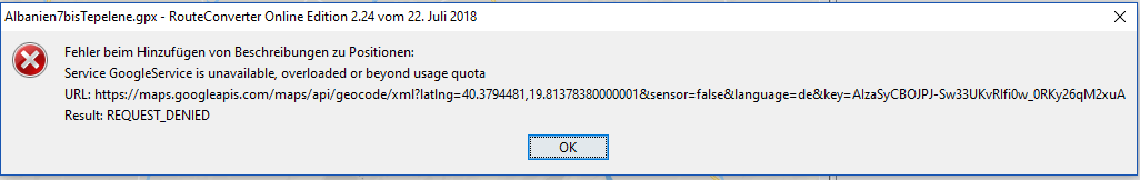 Google verlangt nun eine Kreditkarte für seine API Keys. Da ich nicht für alle RouteConverter