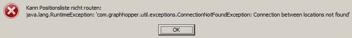in dieser Vorabversion ist Graphhopper bei einer Route mit 49 Punkten auf ca. 140 km hängengeblieben. Die Route hatte ich ursprünglich mit Cruiser erzeugt, dann mit RC in eine IGO-KML-Route konvertiert, diese neu geladen und mit Graphhopper neu rechnen lassen, dabei ist Graphhopper kurz vor Schluß der Route mit dieser Meldung hängengeblieben: