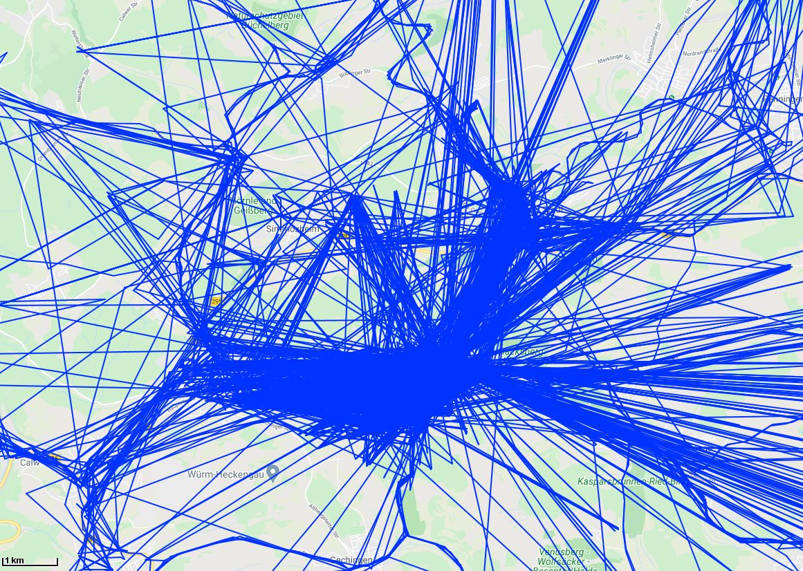 Das Minilog auf dem TomTom hatte die Ausreißer fast nicht, aber das funktioniert seit dem Update nach dem Weeknumber Rollover nicht mehr und vom Google Standortverlauf kriege ich die Rohdaten nur in Paketen zu 2 Monaten, und die sehen dann übel aus: