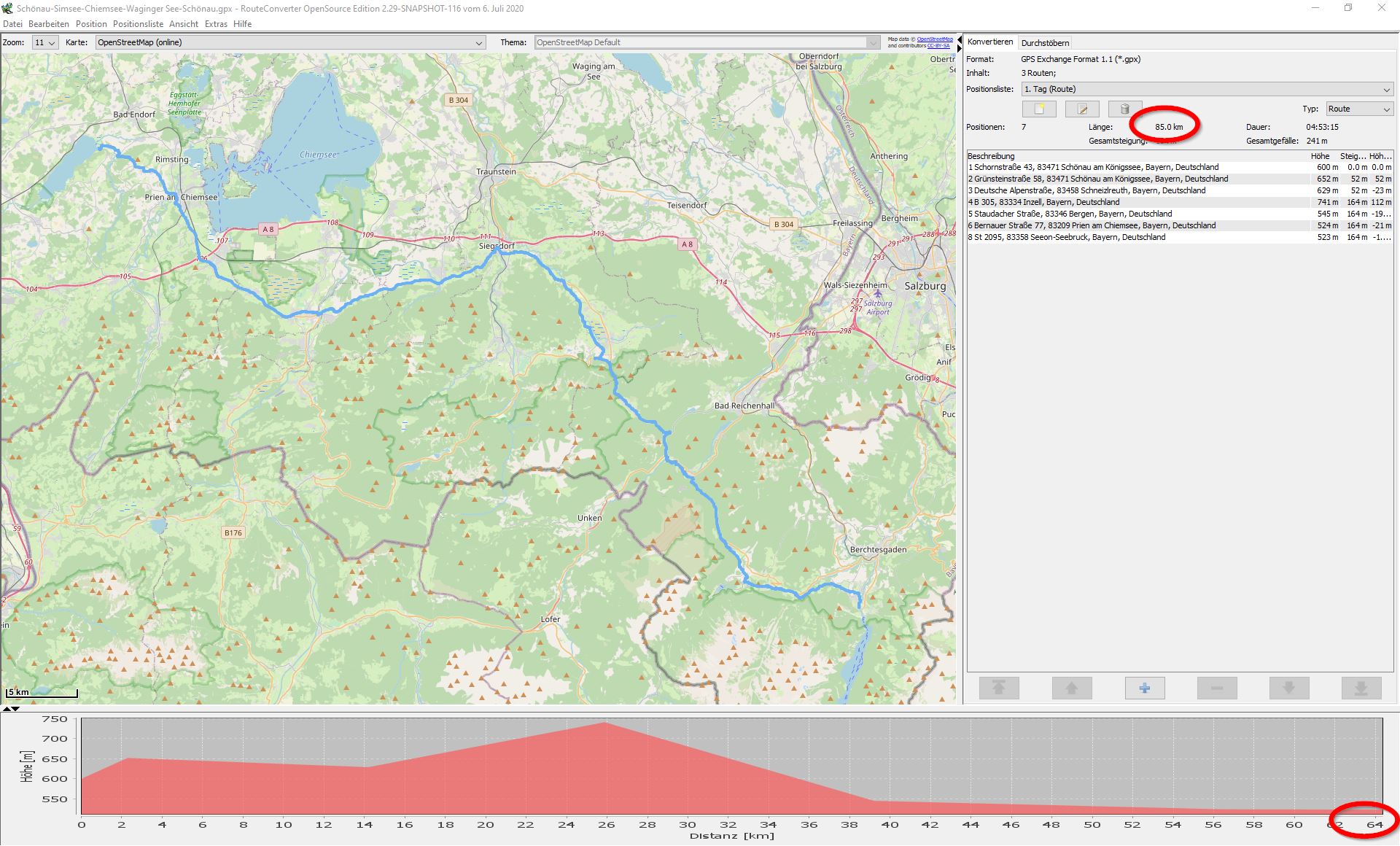 soeben das Wandeln wie von Klaus beschrieben durchgeführt - keine Veränderung der Kilometrierung im Höhenprofil.
