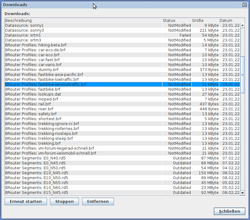 Aufgefallen sind mir die unterschiedlichen Quellen für die Profile mal profiles und mal profiles2: brouter-profiles.xml (<datasource id="brouter-profiles" name="BRouter Profiles" baseUrl="http://brouter.de/brouter/profiles/" directory="brouter/profiles" action="Copy">) und offline-queue.xml (<download description="BRouter Profiles: car-eco.brf" url="http://brouter.de/brouter/profiles2/car-eco.brf" action="Copy" ):